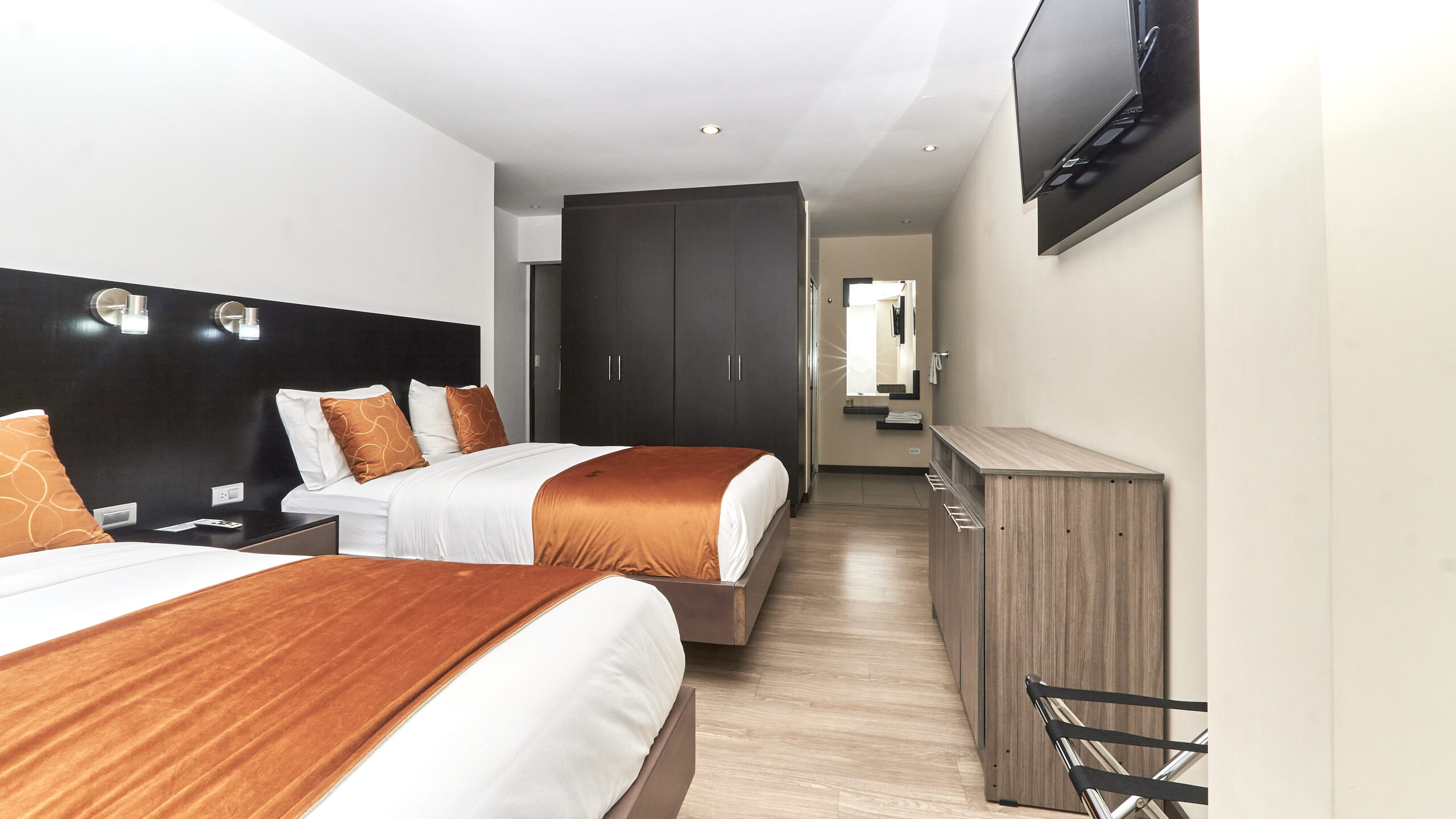 Descubra la comodidad y amplitud de nuestra Suite Doble con vista al jardín, un espacio moderno y acogedor pensado para familias, ejecutivos y viajeros que buscan confort en Cuenca. La suite cuenta con dos camas full, luz natural en cada ambiente, área de cocina equipada, sala con balcón privado, dormitorio máster con baño completo y ducha privada, además de un área de trabajo con escritorio ideal para quienes necesitan combinar descanso y productividad. Perfecta para estancias largas o escapadas familiares, esta suite ofrece tranquilidad, privacidad y una ubicación privilegiada en nuestro hotel en Cuenca.